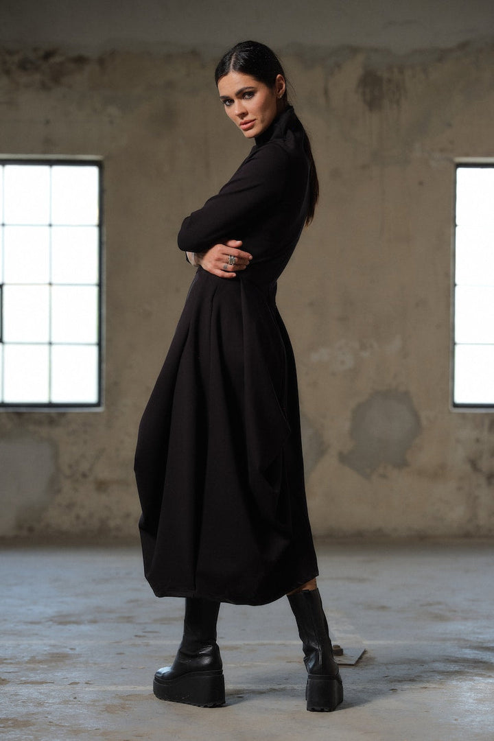 Embrace the fusion of avant-garde design and timeless elegance with this extraordinary asymmetric midi dress. Let it envelop you in an artistic aura, making a statement that transcends conventional fashion to become a wearable work of art – an ideal companion for the colder months that lie ahead.